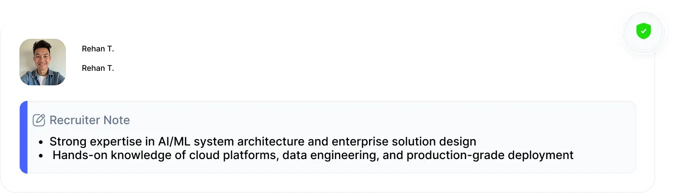 Every candidate that reaches your desk has been personally reviewed by a recruiter who understands your domain. AI narrows the field, and experts make the call.